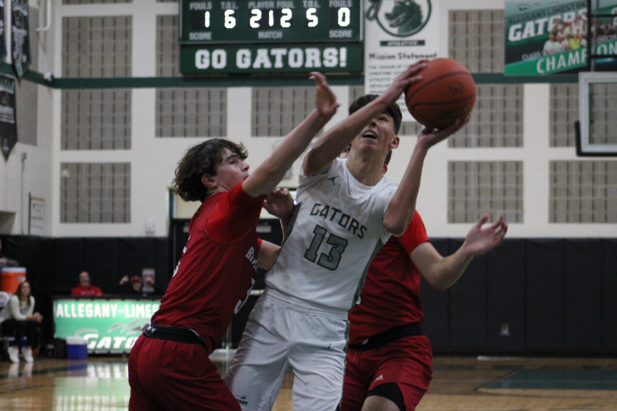 Allegany-Limestone’s Carson Kwiatkowski (13) attempts to rise up for a layup while under heavy pressure from Bradford’s Tarren Reese (3). Kwiatkowski finished with a game-high 25 points in the Gators’ 69-38 win over the Owls. (Spencer Bates)