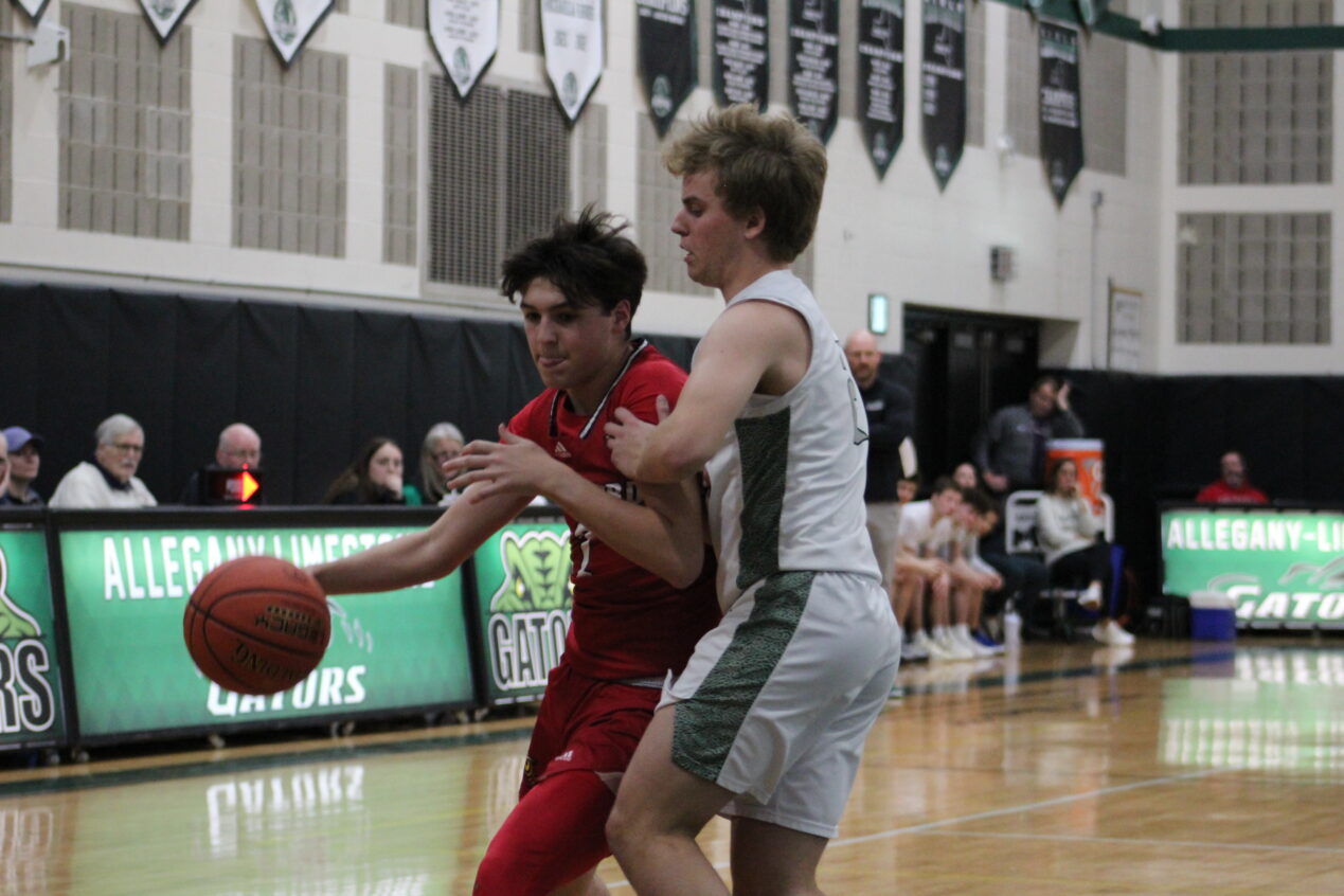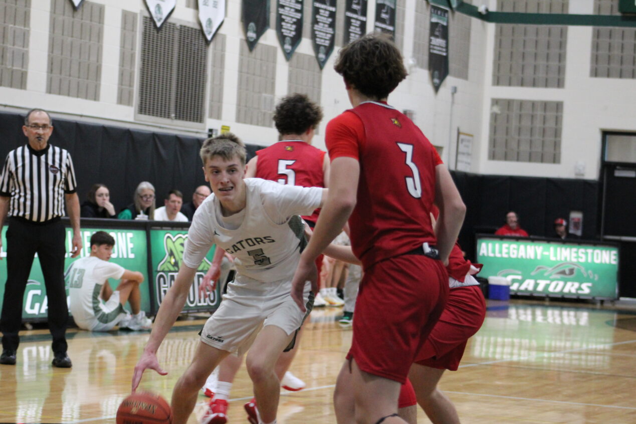 Allegany-Limestone’s Collin Forrest (5) looks to drive into the lane against the Bradford defense. (Spencer Bates)