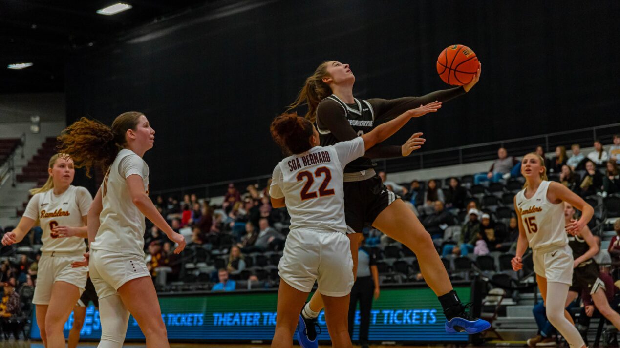 St. Bonaventure forward Caitlin Frost (21) looks for a teammate in the paint. (St. Bonaventure Athletics)