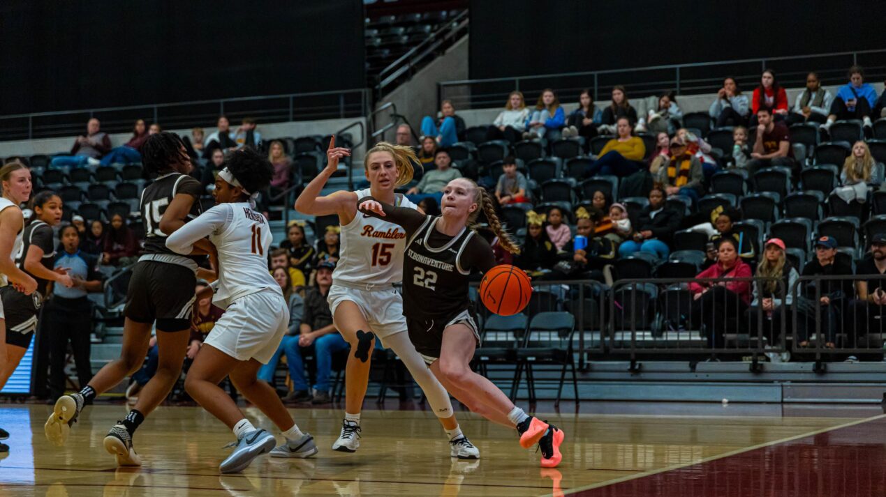 St. Bonaventure guard Dani Haskell (22) drives past her Loyola Chicago defender. Haskell had a game-high 14 points in the Bonnies’ 57-40 loss to the Ramblers. (St. Bonaventure Athletics)