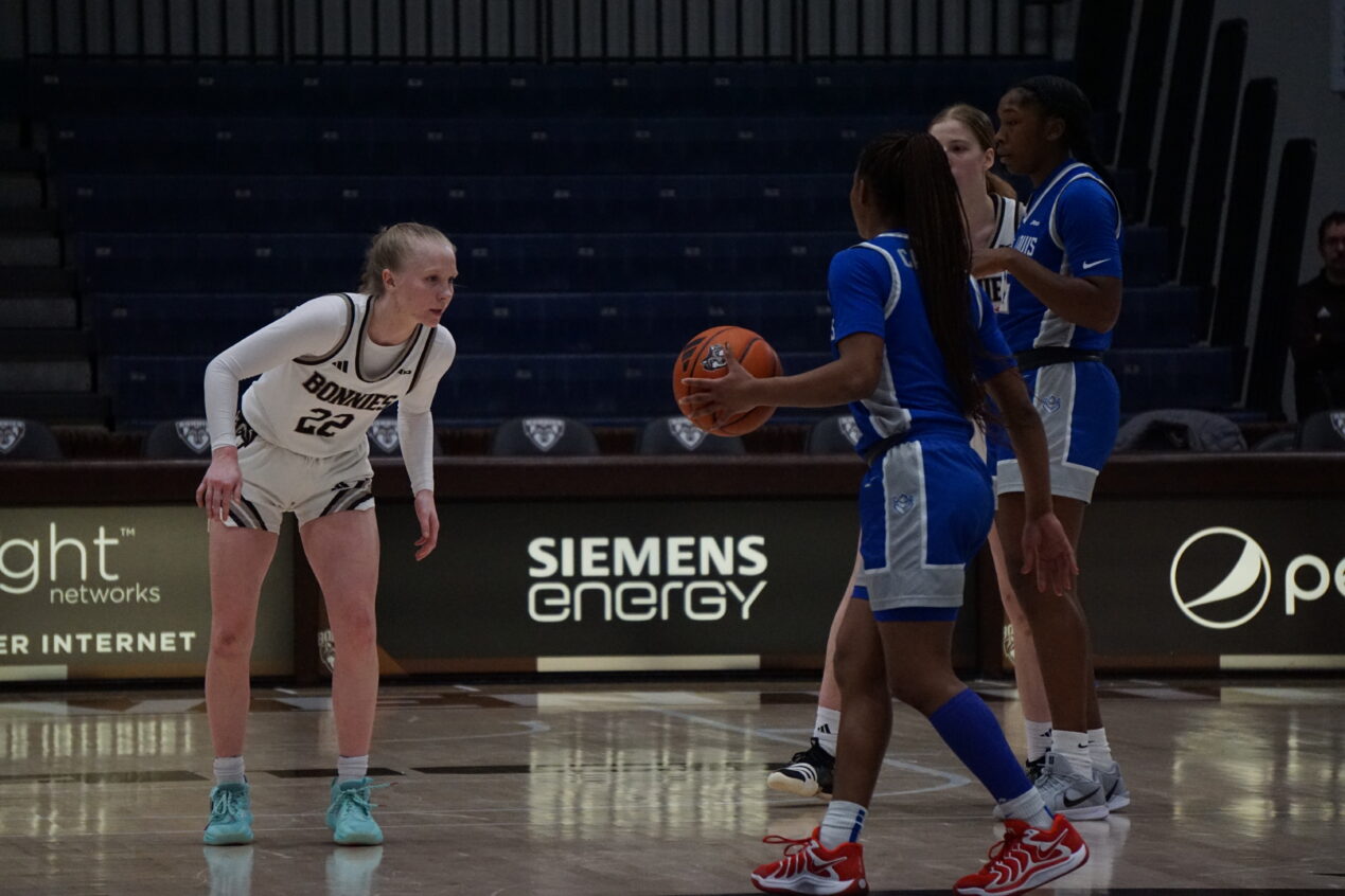 But, luckily for the Bonnies, their big late-game plays were not limited to the offensive end of the floor. On a night in which they had struggled to successfully rebound the basketball — losing the battle on the boards 50-32 overall — Haskell got a piece of an SLU layup that rolled off the rim with Caitlin Frost reeling in the board.
