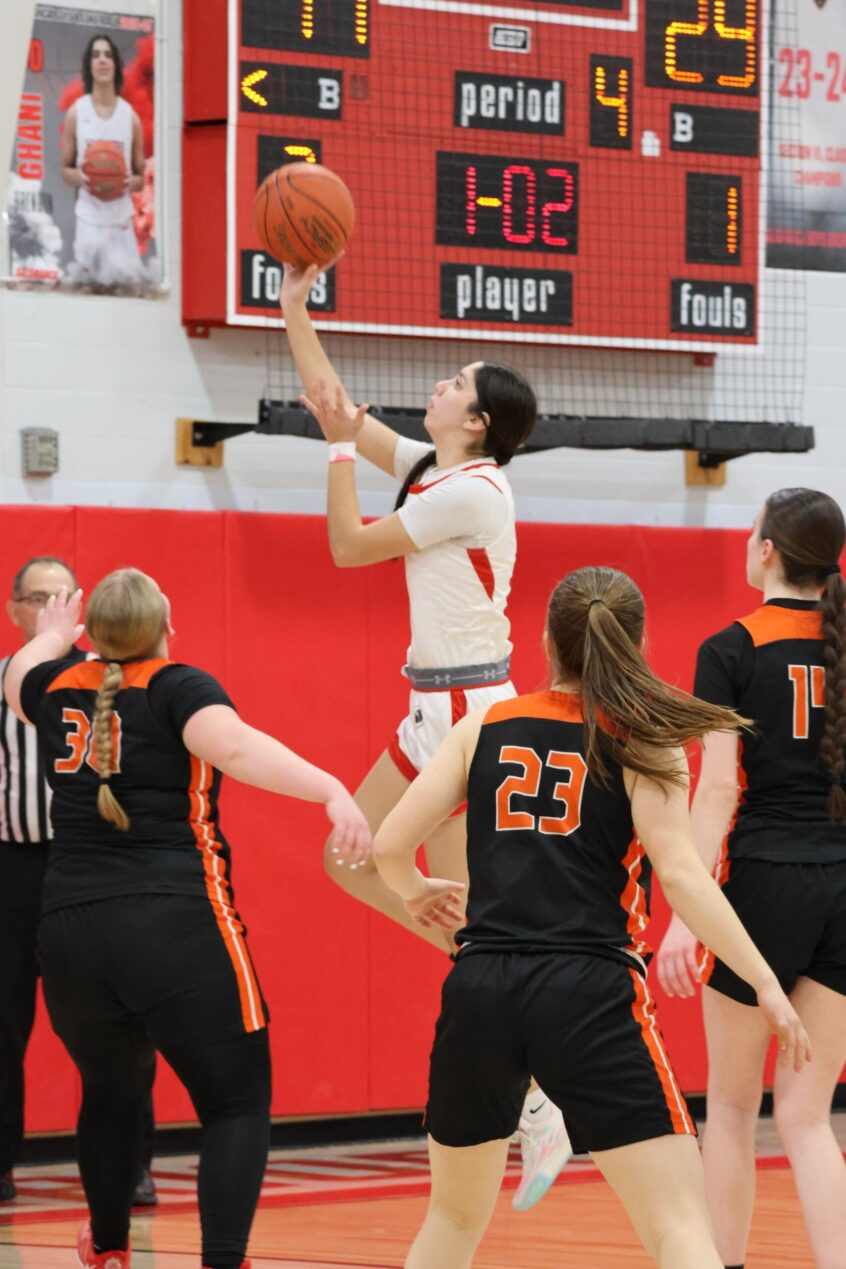 Salamanca’s Skyla Dowdy (4) gets up for a hook shot. Dowdy finished with a game-high 17 points against Fredonia. (Salamanca Warrior Athletics)